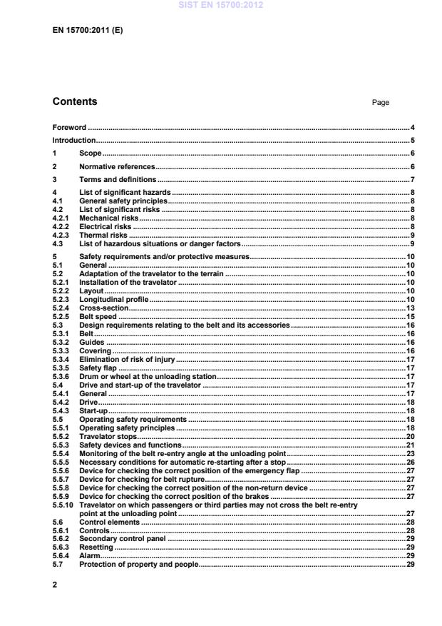 Snow-sliding devices include seated ski equipment for handicapped people. This European Standard has been prepared on the basis of the automatic operation of these installations with no staff permanently present at the actual installation. It covers requirements relating to the prevention of accidents and the safety of workers. This European Standard covers all the significant hazards, hazardous situations and hazardous events specific to travelators, for leisure or winter sports activities, when they are used in conformity with the application for which they are intended, as well as for inappropriate applications which could be reasonably foreseeable by the manufacturer (see Clause 4). This European Standard does not apply either to moving walks as specified in EN 115 or to loading bands as specified in EN 1907. This European Standard does not apply to travelators manufactured prior to the date of its publication as an EN. 2 Normative references The following reference documents are indispensible for the application of this document. For dated references, only the edition cited applies. For undated references, the latest edition of the referenced document (including any amendments) applies. EN 115-1, Safety of escalators and moving walks ⎯ Part 1: Construction and installation EN 619:2002, Continuous handling equipment and systems ⎯ Safety and EMC requirements for equipment for mechanical handling of unit loads EN 953, Safety of machinery ⎯ Guards ⎯ General requirements for the design and construction of fixed and movable guards EN 981, Safety of machinery ⎯ System of auditory and visual danger and information signals EN 1037, Safety of machinery ⎯ Prevention of unexpected start-up EN 1088, Safety of machinery ⎯ Interlocking devices associated with guards ⎯ Principles for design and selection EN 1907:2005, Safety requirements for cableway installations designed to carry persons ⎯ Terminology EN 1993-1-1, Eurocode 3: Design of steel structures ⎯ Part 1-1: General rules and rules for buildings EN 60204-1, Safety of machinery ⎯ Electrical equipment of machines ⎯ Part 1: General requirements SIST EN 15700:2012