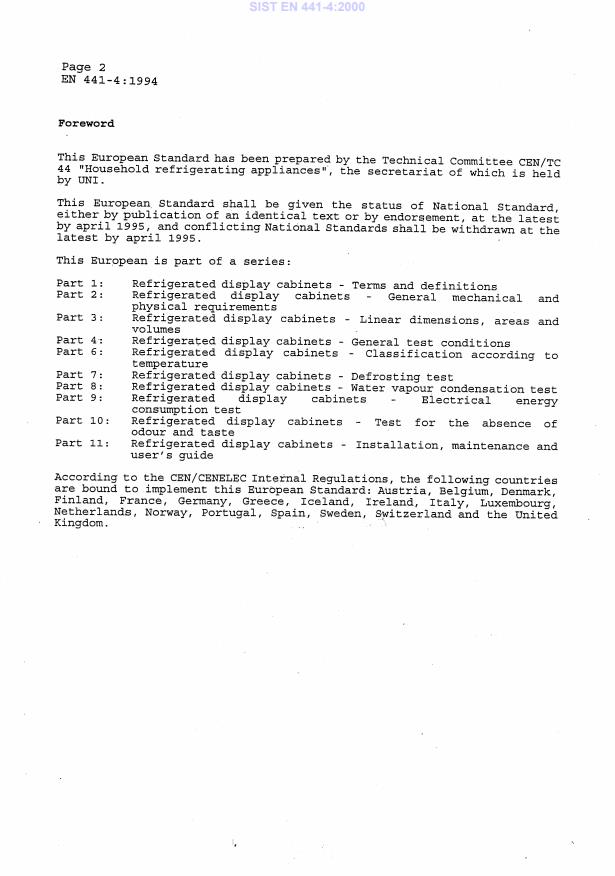 EN 441-4:1994 is a standard published by the European Committee for Standardization (CEN). Its full title is "Refrigerated display cabinets - Part 4: General test conditions". This standard covers: This standard specifies marking and performance requirements, methods of classification, methods of determining dimensions and methods of test for commercial refrigerated cabinets for the sale and display of food products. This standard does not cover refrigerated vending machines.