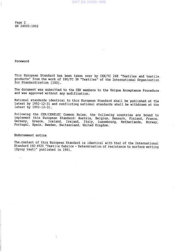 EN 24920:1992 is a standard published by the European Committee for Standardization (CEN). Its full title is "Textiles - Determination of resistance to surface wetting (spray test) of fabrics". This standard covers: The method is applicable to all fabrics which may or may not have been given a water-resistant or water-repellent finish. It is not intended to predict the rain penetration resistance of fabrics, since it does not measure penetration of water through the fabric. Before testing carried out the specimen shall be conditioned for at least 24 h in the standard atmosphere for testing textiles.