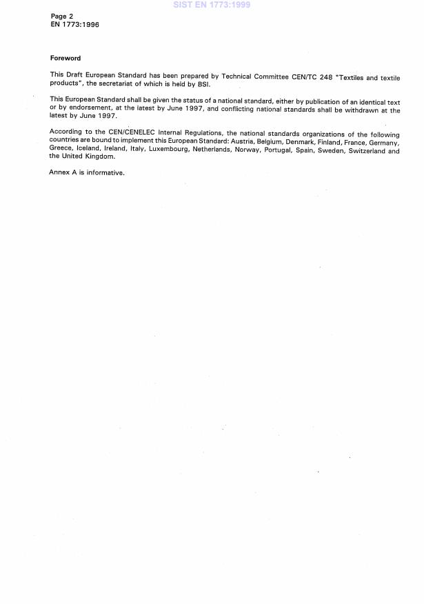 - EN ISO 139:2015 - Textiles - Standard atmospheres for conditioning and testing, which complements EN 1773 by defining the environmental conditions for fabric relaxation.