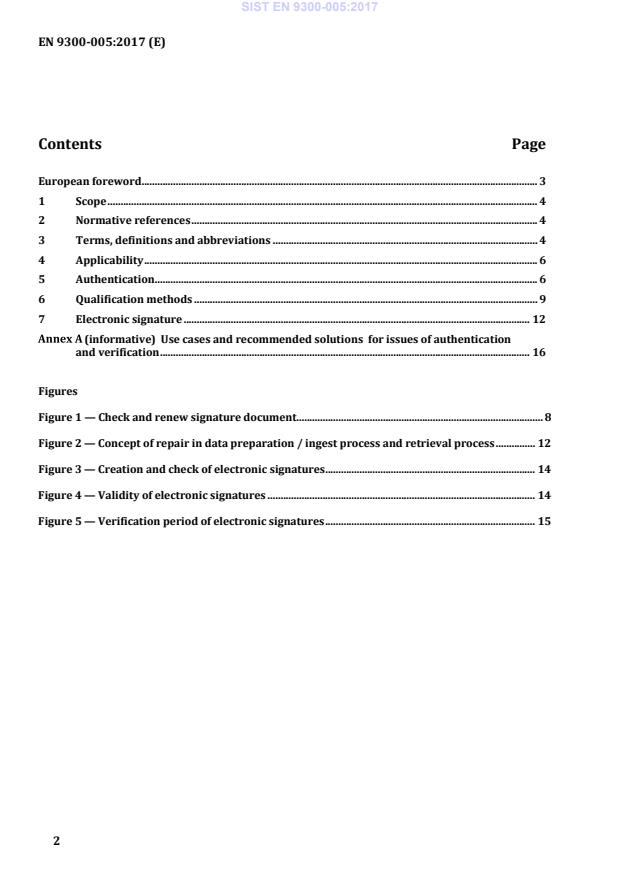 Standard EN 9300-005 opisuje temeljne smernice in načela avtentikacije in overjanja integritete digitalnih dokumentov ter njihove vsebine pri postopkih arhiviranja in iskanja. Deli standarda EN 9300-x00 o podatkovnih domenah bodo določali ukrepe za kvalifikacijo vsebine dokumenta. Temeljne smernice, podane v tem dokumentu, zajemajo zahteve, metode in priporočila za njihovo