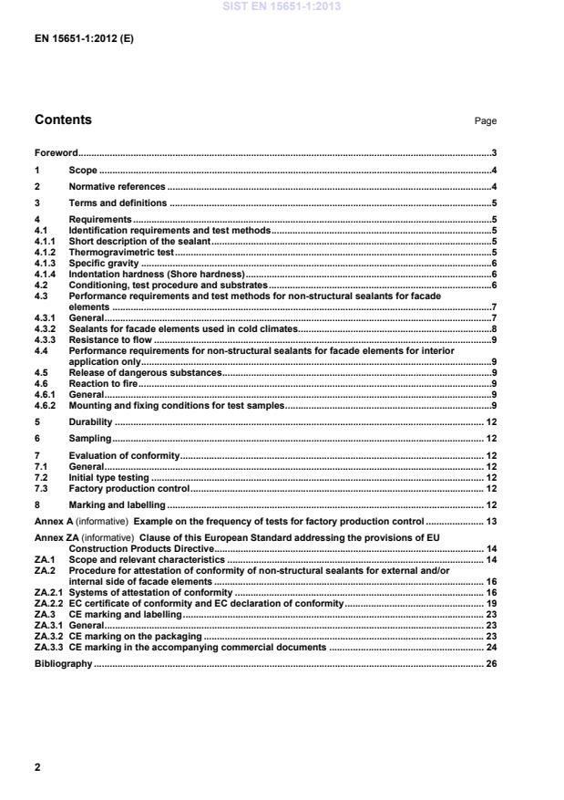Clause of this European Standard addressing the provisions of EU Construction Products Directive . 14ZA.1Scope and relevant characteristics . 14ZA.2Procedure for attestation of conformity of non-structural sealants for external and/or internal side of facade elements . 16ZA.2.1Systems of attestation of conformity . 16ZA.2.2EC certificate of conformity and EC declaration of conformity . 19ZA.3CE marking and labelling . 23ZA.3.1 General . 23ZA.3.2 CE marking on the packaging . 23ZA.3.3 CE marking in the accompanying commercial documents . 24Bibliography . 26 SIST EN 15651-1:2013