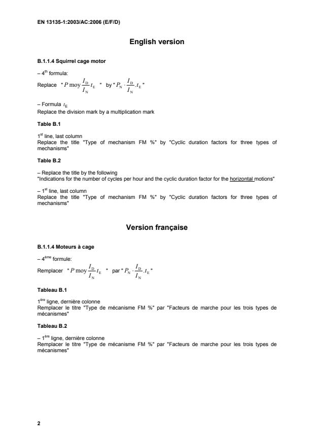 EN 13135-1:2003/AC:2006 is a corrigendum published by the European Committee for Standardization (CEN). Its full title is "Cranes - Safety - Design - Requirements for equipment - Part 1: Electrotechnical equipment". This standard covers: TC - Modifications to B.1.1.4 and Tables B.1 and B.2