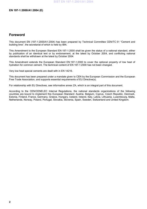 This Amendment extends the European Standard EN 197-1:2000 to cover the optional property of low heat of