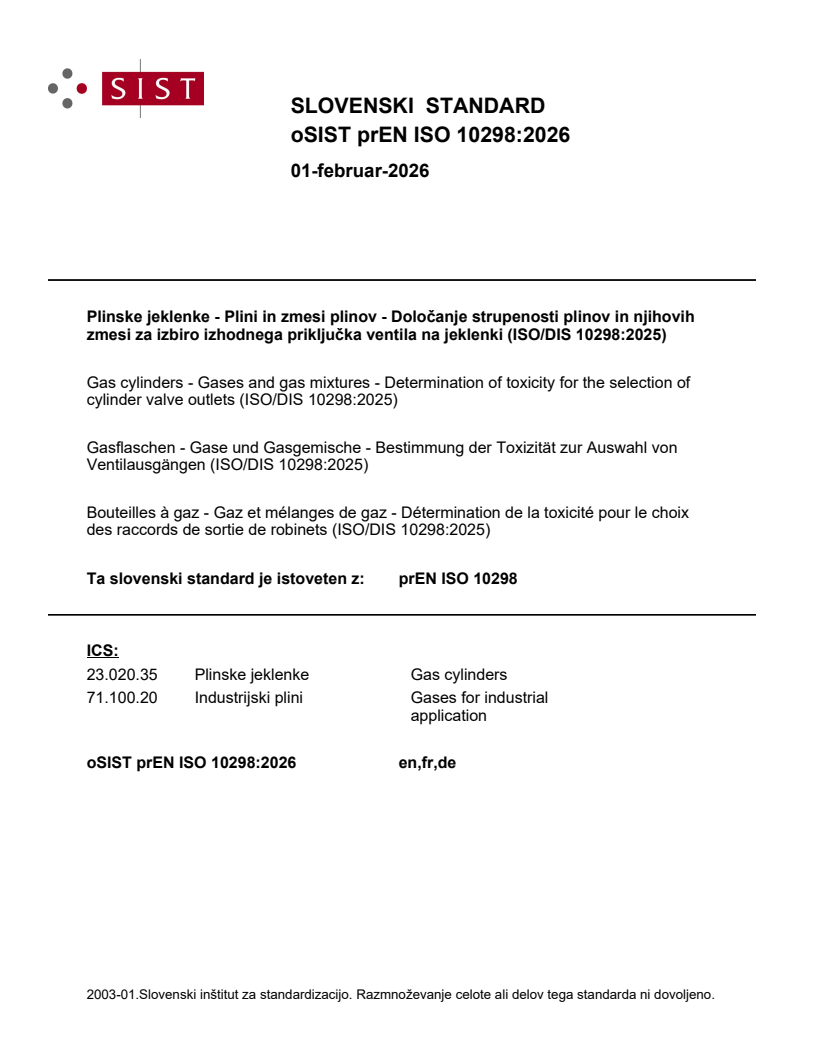 Plinske jeklenke - Plini in zmesi plinov - Določanje strupenosti plinov in njihovih zmesi za izbiro izhodnega priključka ventila na jeklenki (ISO/DIS 10298:2025)