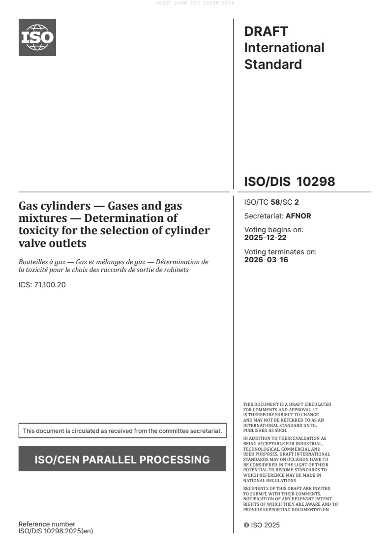 prEN ISO 10298 is a draft published by the European Committee for Standardization (CEN). Its full title is "Gas cylinders - Gases and gas mixtures - Determination of toxicity for the selection of cylinder valve outlets (ISO/DIS 10298:2025)". This standard covers: ISO 10298:2018 lists the best available acute-toxicity data of gases taken from a search of the current literature to allow the classification of gases and gas mixtures for toxicity by inhalation.