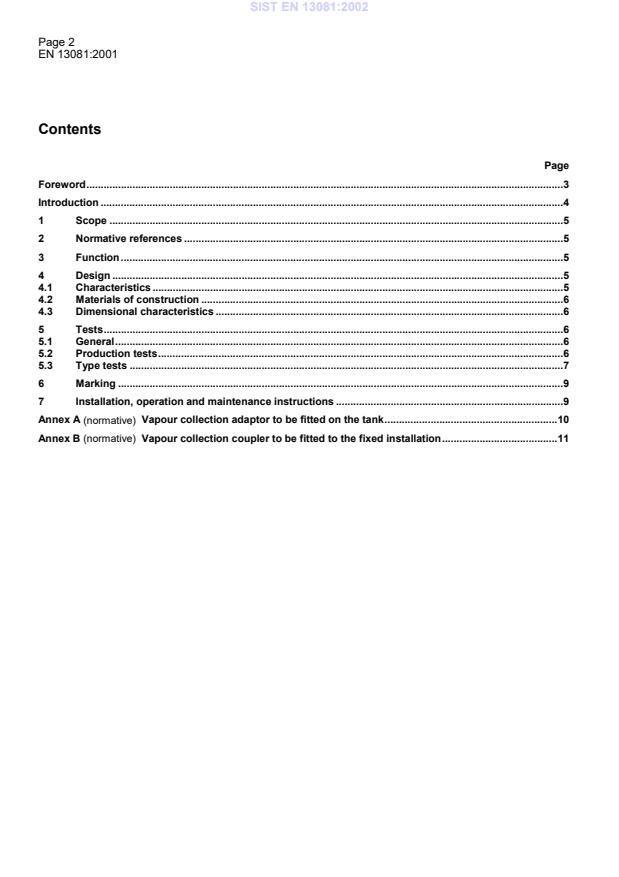Page 2EN 13081:2001ContentsPageForeword.3Introduction.41Scope.52Normative references.53Function.54Design.54.1Characteristics.54.2Materials of construction.64.3Dimensional characteristics.65Tests.65.1General.65.2Production tests.65.3Type tests.76Marking.97Installation, operation and maintenance instructions.9Annex A (normative)