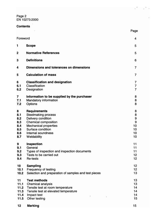 EN 10273:2000 is a standard published by the European Committee for Standardization (CEN). Its full title is "Hot rolled weldable steel bars for pressure purposes with specified elevated temperature properties". This standard covers: This European Standard specifies the technical delivery conditions for hot rolled weldable steel bars for the construction of pressure equipments for use at elevated temperatures. The general technical delivery conditions in EN 10021 also apply to products supplied in accordance with this European Standard.