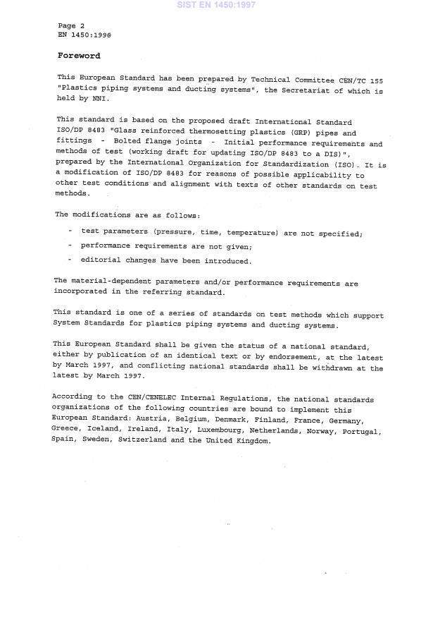 EN 1450:1996 is a standard published by the European Committee for Standardization (CEN). Its full title is "Plastics piping systems - Glass-reinforced thermosetting plastics (GRP) components - Test methods to prove the design of bolted flange joints". This standard covers: This standard specifies methods of test for joints with bolted flanges for plastics piping systems of glass-reinforced thermosetting plastics (GRP) for buried and above ground pipelines. This standard is only applicable to the jointand covers methods of test to prove its design.