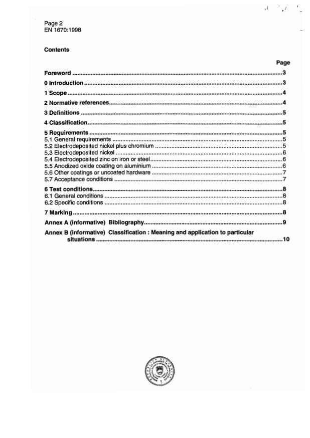 EN 1670:1998 is a standard published by the European Committee for Standardization (CEN). Its full title is "Building hardware - Corrosion resistance - Requirements and test methods". This standard covers: This European Standard specifies the requirements for the corrosion resistance of hardware for doors, windows, shutters and curtain walling. The standard specifies requirements for both coated and uncoated surfaces, four grades (classes) of corrosion resistance being laid down in accordance with the different conditions of use (grades(classes) 1 to 4). A grade (class) 0 is also included for which no requirements have been specified. Requirements for levels of corrosion higher than those laid down for grade (class) 4 have not been included in this standard and are subject to agreement where required.