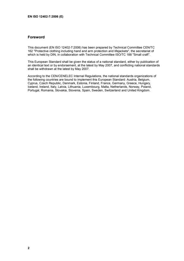 This document (EN ISO 12402-7:2006) has been prepared by Technical Committee CEN/TC 162 "Protective clothing including hand and arm protection and lifejackets", the secretariat of which is held by DIN, in collaboration with Technical Committee ISO/TC 188 "Small craft".
