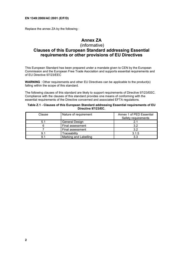EN 1349:2000/AC:2001 is associated with the following European legislation: EU Directives/Regulations: 97/23/EC; Standardization Mandates: M/071. When a standard is cited in the Official Journal of the European Union, products manufactured in conformity with it benefit from a presumption of conformity with the essential requirements of the corresponding EU directive or regulation.