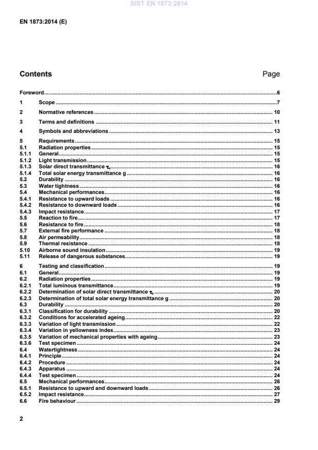 EN 1873:2014 is a standard published by the European Committee for Standardization (CEN). Its full title is "Prefabricated accessories for roofing - Individual rooflights of plastics - Product specification and test methods". This standard covers: This European Standard specifies requirements for rooflights made of plastic materials (e.g. GF-UP, PC, PMMA, PVC) and rooflights with upstands made of e.g. GF-UP, PVC, steel, aluminium or wood for installation in roofs. These rooflights serve the purpose of introducing daylight. This European Standard applies to rooflights with a rectangular or circular ground plan (see Figures 1 and 2), with an opening span (width) or diameter not larger than 2,5 m and an opening length not larger than 3,0 m in roof pitches up to 25°. This document does not cover rooflights which contribute to the load-bearing or stiffness of the roof itself. This European Standard applies to rooflights and rooflights with upstand, where a single manufacturer provides all components of the rooflight with upstand, which are bought in a single purchase. This European Standard applies to rooflights with one or several translucent parts. Rooflights may be opened by means of opening devices in one or more parts for ventilation. The possible additional functions of day to day ventilation, smoke and heat ventilation e.g. in case of fire in accordance with EN 12101 2, roof access, and/ or slinging point e.g. in accordance with EN 795 are outside the scope of this document. This European Standard does not include calculations with regard to construction, design requirements and installation techniques. NOTE Guidelines for safety, application, use and maintenance of individual rooflights are presented in Annex A.