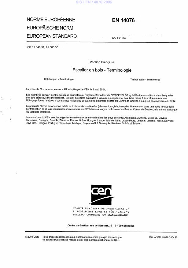 EN 14076:2004 is a standard published by the European Committee for Standardization (CEN). Its full title is "Timber stairs - Terminology". This standard covers: This European Standard defines general terms relating to timber stairs and timber prefabricated stairs.