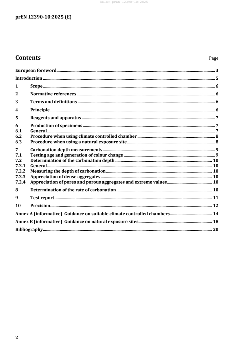 This document specifies a method of determining the carbonation rate of a concrete, expressed in mm/√a. This document establishes a procedure where a standardized climate controlled chamber is used and where specimens are placed on a natural exposure site protected from direct rainfall. The standardized climate controlled chamber procedure is the reference method. These procedures are applicable for the initial testing of concrete, including those manufactured with slowly reacting binders, provided that the ages at which the carbonation depth is measured, the number of measurements required to calculate the carbonation rate, as well as the length of exposure to CO2, are appropriately selected, as described in this document. These procedures are not applicable for factory production control.