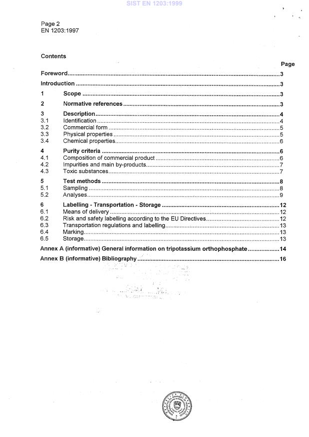 EN 1203:1997 is a standard published by the European Committee for Standardization (CEN). Its full title is "Chemicals used for treatment of water intended for human consumption - Tripotassium orthophosphate". This standard covers: This European Standard describes the characteristics and specifies the requirements and the corresponding test methods for tripotassium orthophosphate used for treatment of water intended for human consumption. It gives information on its use in water treatment.