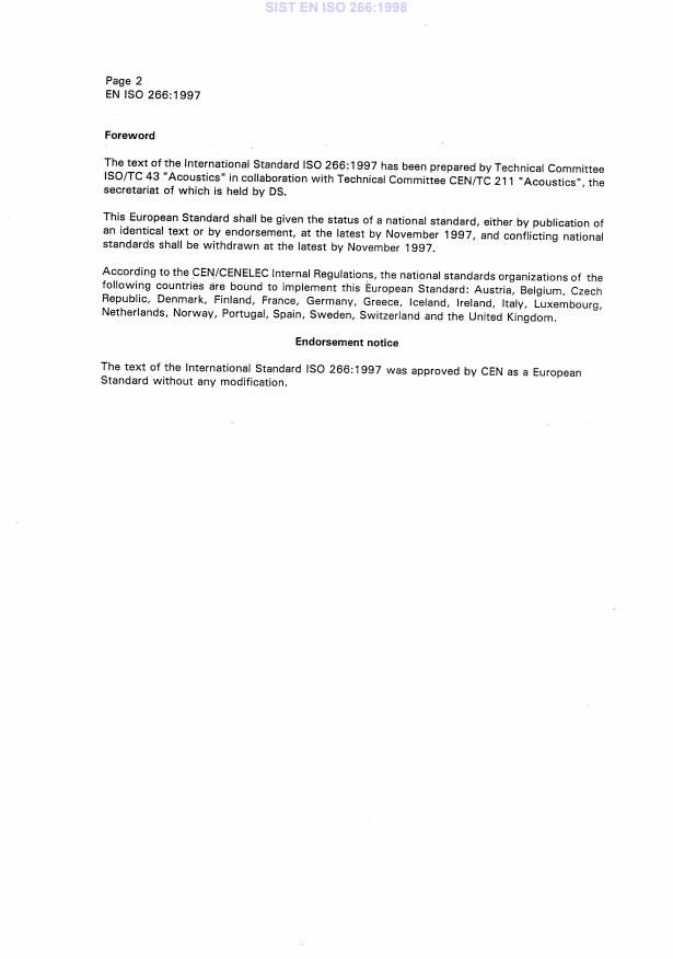EN ISO 266:1997, titled Acoustics - Preferred frequencies, is an international standard developed by ISO Technical Committee ISO/TC 43 (Acoustics) and adopted by CEN. This standard defines a series of preferred frequencies used as a common framework for acoustical measurements and data comparison. The frequency series is based on the R10 preferred number series from ISO 3 and uses a reference frequency of 1,000 Hz, which aligns with the phon scale reference in acoustics.