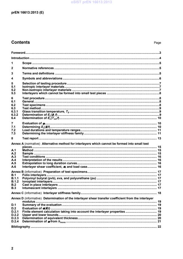 prEN 16613 is a draft published by the European Committee for Standardization (CEN). Its full title is "Glass in building - Laminated glass and laminated safety glass - Determination of interlayer mechanical properties". This standard covers: This European Standard specifies a test method for determining the mechanical viscoelastic properties of interlayer materials. The interlayers under examination are those used in the production of laminated glass and/or laminated safety glass. The interlayer properties are needed in order to determine the load resistance of laminated glass as part of a general calculation method for the load resistance of glass. NOTE CEN/TC 129/WG 8 "Mechanical strength" is preparing a draft for the calculation method [1]. From the tensile modulus in particular conditions of temperature and load duration, an interlayer can be placed into a family that relates to a specific interlayer shear transfer coefficient, [omega]. This value can be used in a simplified calculation method. An informative annex explains the background to the determination of families relating to a specific interlayer shear transfer coefficient.