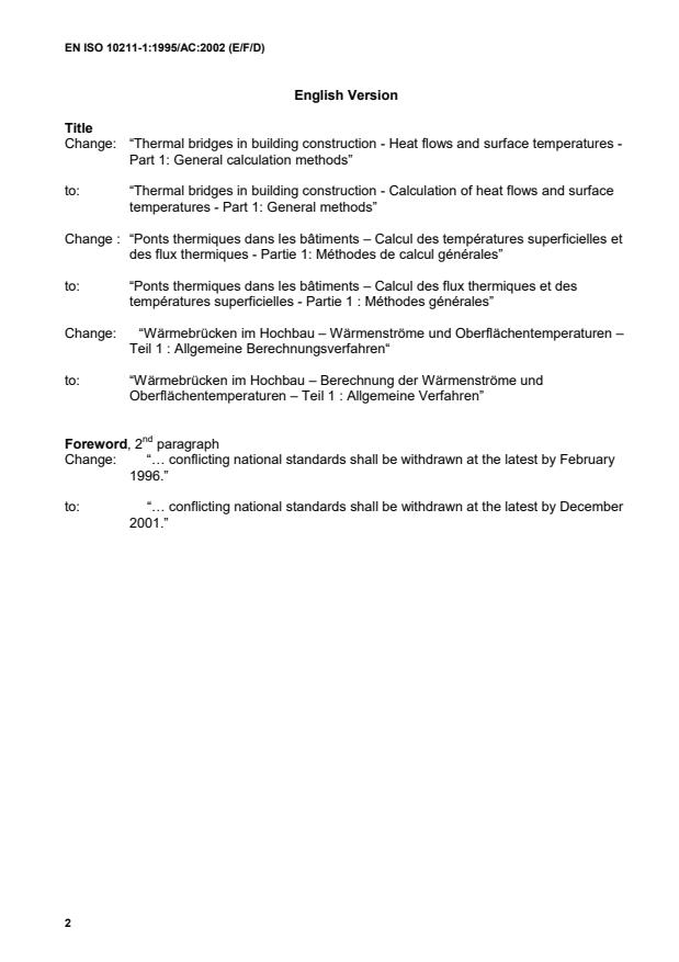 EN ISO 10211-1:1995/AC:2002 is a corrigendum published by the European Committee for Standardization (CEN). Its full title is "Thermal bridges in building construction - Calculation of heat flows and surface temperatures - Part 1: General methods (ISO 10211-1:1995)". This standard covers: TC - Numerous editorial changes