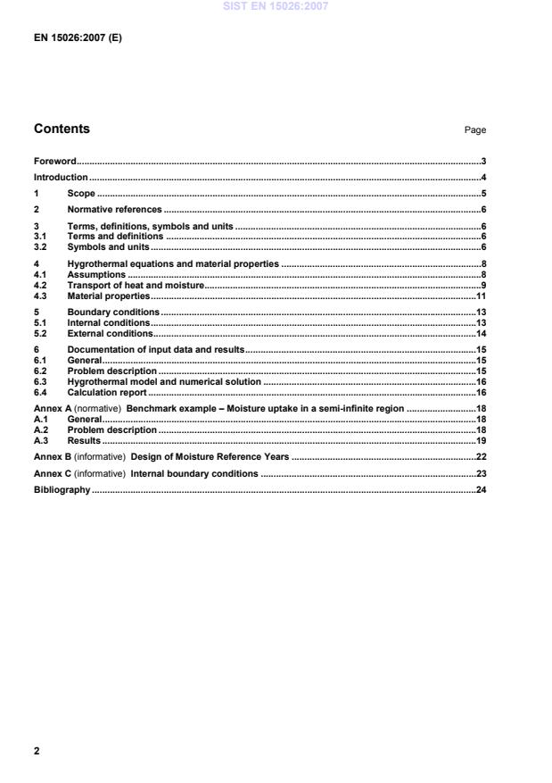 • Temperature and heat flux distributions and temporal variations • Water content, relative humidity and moisture flux distributions and temporal variations Post processing • Energy use, economy & ecology • Biological growth, rot and corrosion • Moisture related damage and degradation The post processing tools are not part of this standard. As far as possible references to publications dealing with these tools is given. SIST EN 15026:2007