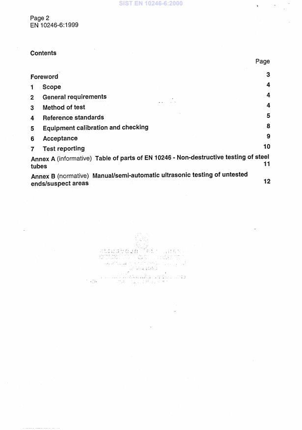 This Part of EN 10246 specifies the requirements for automatic ultrasonic shear wave testing of seamless steel tubes for the detection of transverse imperfections. The standard specifies acceptance levels and calibration procedures. This Part of EN 10246 is applicable to the inspection of tubes with an outside diameter equal to or greater than 10 mm. European Standard EN 10246 "Non-destructive testing of steel tubes" comprises the Parts shown in Annex A.