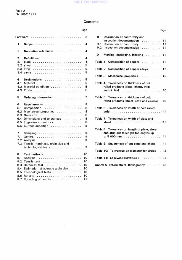 EN 1652:1997 (issued by CEN) specifies requirements for copper and copper alloys in the form of plate, sheet, strip and circles for general purposes. The standard defines the required composition, property requirements, and tolerances on dimensions and form. It also covers sampling procedures, methods of test for verification of conformity, and the delivery conditions suppliers and purchasers should use.