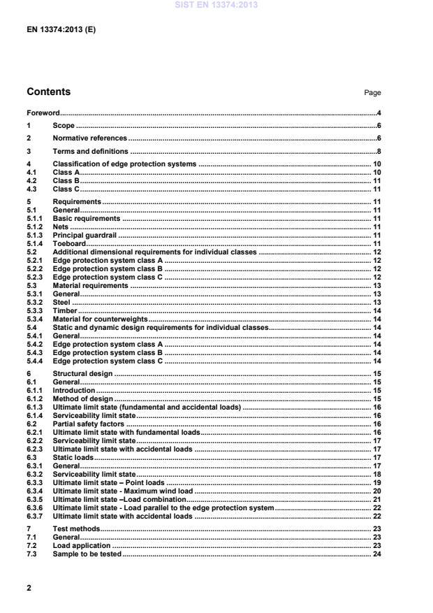 1 Scope This European Standard specifies the requirements and test methods for temporary edge protection systems for use during construction or maintenance of buildings and other structures. This standard applies to edge protection systems for flat and inclined surfaces and specifies the requirements for three classes of temporary edge protection. For edge protection systems with an arrest function (e.g. falling or sliding down a sloping roof) this standard specifies requirements for energy absorption. This standard includes edge protection systems, some of which are fixed to the structure and others, which rely on gravity and friction on flat surfaces. This standard does not provide requirements for edge protection systems intended for: protection against impact from vehicles or from other mobile equipment, protection from sliding down of bulk loose materials, snow etc, protection of areas accessible to the public. This standard does not apply to side protection on scaffolds according to EN 12811-1 and EN 1004. NOTE This does not prevent these systems to be used on temporary structures. 2 Normative references The following documents, in whole or in part, are normatively referenced in this document and are indispensable for its application. For dated references, only the edition cited applies. For undated references, the latest edition of the referenced document (including any amendments) applies. EN 74-1, Couplers, spigot pins and baseplates for use in falsework and scaffolds — Part 1: Couplers for tubes — Requirements and test procedures EN 74-2, Couplers, spigot pins and baseplates for use in falsework and scaffolds — Part 2: Special couplers — Requirements and test procedures EN 74-3, Couplers, spigot pins and baseplates for use in falsework and scaffolds — Part 3: Plain base plates and spigot pins — Requirements and test procedures EN 338, Structural timber — Strength classes EN 596, Timber structures — Test methods — Soft body impact test of timber framed walls EN 1263-1, Safety nets — Part 1: Safety requirements, test methods EN 1990, Eurocode — Basis of structural design EN 1991-1-4, Eurocode 1: Actions on structures — Part 1-4: General actions — Wind actions EN 1993-1-1, Eurocode 3: Design of steel structures — Part 1-1: General rules and rules for buildings EN 1993-1-2, Eurocode 3: Design of steel structures — Part 1-2: General rules — Structural fire design SIST EN 13374:2013
