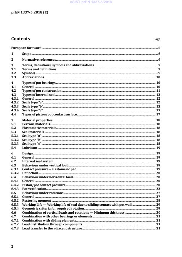prEN 1337-5 is a draft published by the European Committee for Standardization (CEN). Its full title is "Structural bearings - Part 5: Pot bearings". This standard covers: This document specifies rules for the design, testing and manufacture of fixed and sliding pot bearings. It is applicable to pot bearings: - with elastomeric pads made from natural rubber (NR) or chloroprene rubber (CR) up to 1 500 mm diameter, - with pot and piston made from ferrous materials, - with seals tested for different accumulated slide paths due to rotations between piston and pot of a) 500 m, b) 1 000 m or c) 2 000 m, - with seals made from specific austenitic steel, brass, POM or carbon filled PTFE, - subjected to operating temperature ranges between -25 °C and +50 °C or -40 °C and +50 °C, - subjected to operating temperatures up to +70 °C for repeated periods of less than 8 h. This document will be used in conjunction with prEN 1337-1:2018 and other relevant parts of the prEN 1337 series.