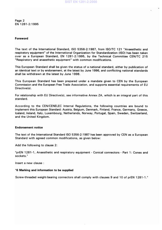 Foreword . ISO (the International Organization for Standardization) is a worldwide federation of national Standards bodies (ISO member bedies). The work of preparing International Standards is normally carried out through ISO technical committees. Esch member body interested in a subject for which a technical committee has been established has the right to be represented on that committee. International organizations, govern- mental and non-governmental, in liaison with ISO, also take part in the work. Draft International Standards adopted by the technical committees are circulated to the member bodies for approval before their acceptance as International Standards by the ISO Council. They are approved in accordance with ISO procedures requiring at least 75 % approval by the member bodies voting. International Standard ISO 5356-2 was prepared by Technical Committee ISO/TC 121, Anaesthetic and respira tory equipmen t. Users should note that all International Standards undergo revision from time to time and that any reference made herein to any other International Standard implies its latest edition, unless otherwise stated. 0 International Organkation for Standardkation, 1987 Printed in Switzerland SIST EN 1281-2:2000