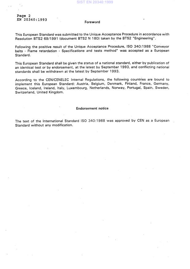 EN 20340:1993 is a standard published by the European Committee for Standardization (CEN). Its full title is "Conveyor belts - Flame retardation - Specifications and test method (ISO 340:1988)". This standard covers: Conveyor belts - Flame retardation - Specifications and test method (ISO 340:1988)