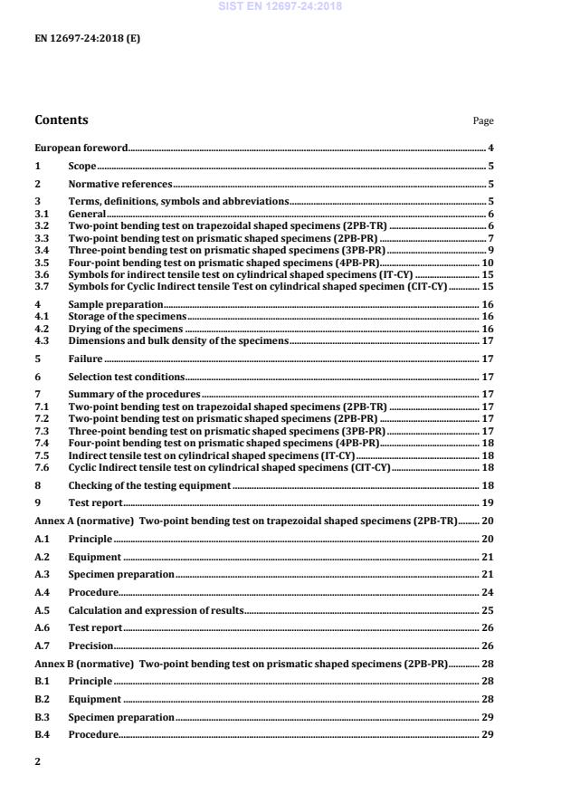 - Test methods included: bending tests (two-point, three-point, four-point on prismatic/trapezoidal specimens) and tensile tests (indirect tensile on cylindrical specimens and a cyclic indirect tensile test - CIT-CY). Annexes A–F provide the detailed procedures for each method.