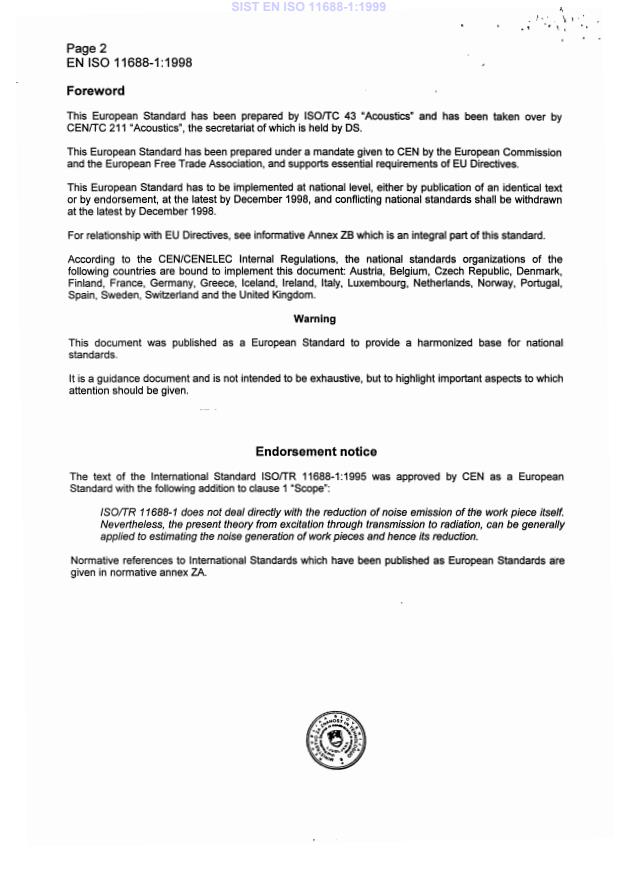 EN ISO 11688-1:1998 is associated with the following European legislation: EU Directives/Regulations: 98/37/EC; Standardization Mandates: M/BC/CEN/88/13. When a standard is cited in the Official Journal of the European Union, products manufactured in conformity with it benefit from a presumption of conformity with the essential requirements of the corresponding EU directive or regulation.