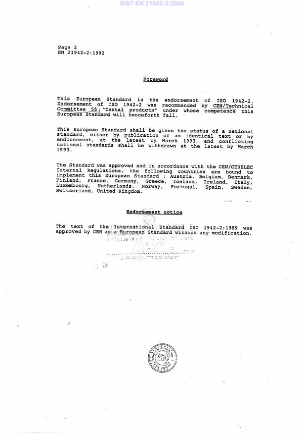 EN 21942-2:1992 is a standard published by the European Committee for Standardization (CEN). Its full title is "Dental vocabulary - Part 2: Dental materials (ISO 1942-2:1989)". This standard covers: Text was withdrawn on 2010-04-16 by TC resolution.