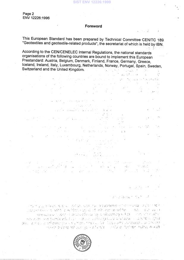 ENV 12226:1996 is a standardization document published by the European Committee for Standardization (CEN). Its full title is "Geotextiles and geotextile-related products - General tests for evaluation following durability testing". This standard covers: This standard specifies test methods for determining the change in specific properties of aged geotextiles. It is applicable to geotextiles and geotextile-related products.