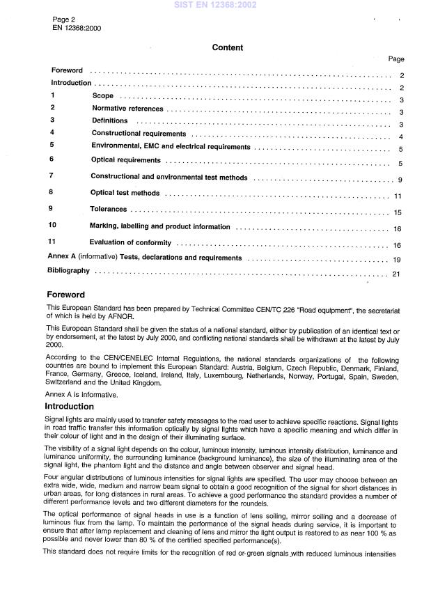 EN 12368:2000 is a standard published by the European Committee for Standardization (CEN). Its full title is "Traffic control equipment - Signal heads". This standard covers: This European Standard only applies to red, yellow and green signal lights for road traffic with 200 mm and 300 mm roundels. It defines the requirements for the visual, structural, environmental performances and testing of signal heads for pedestrian and road traffic use. Portable signal lights are specifically excluded from the scope of this standard.