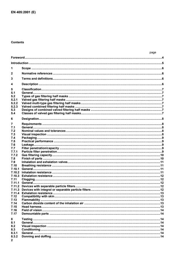 EN 405:2001 is a standard published by the European Committee for Standardization (CEN). Its full title is "Respiratory protective devices - Valved filtering half masks to protect against gases or gases and particles - Requirements, testing, marking". This standard covers: This European Standard specifies the performance requirements, test methods and marking requirements for valved filtering half masks incorporating either gas or combined filters as respiratory protective devices except for escape purposes. It does not cover gas filtering half masks which do not have valves or are fitted only with exhalation valves. It does not cover devices designed for use in circumstances where there is or might be an oxygen deficiency (oxygen less than a volume fraction of 17 %). Laboratory and practical performance tests are included for the assessment of compliance with the requirements.