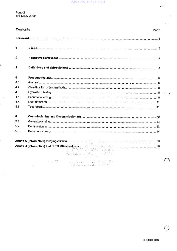 EN 12327:2000 is a standard published by the European Committee for Standardization (CEN). Its full title is "Gas supply systems - Pressure testing, commissioning and decommissioning procedures - Functional requirements". This standard covers: This European Standard describes common principles for pressure testing, commissioning and decommissioning of gas supply systems as covered by the European functional standards of the Technical Committee CEN/TC 234 (see Annex B) except for pipework for buildings according to EN 1775. They have been extracted from the detailed codes of practice and operating manuals in the member countries. The specified procedures are applicable to strength testing, tightness testing and combined testing.