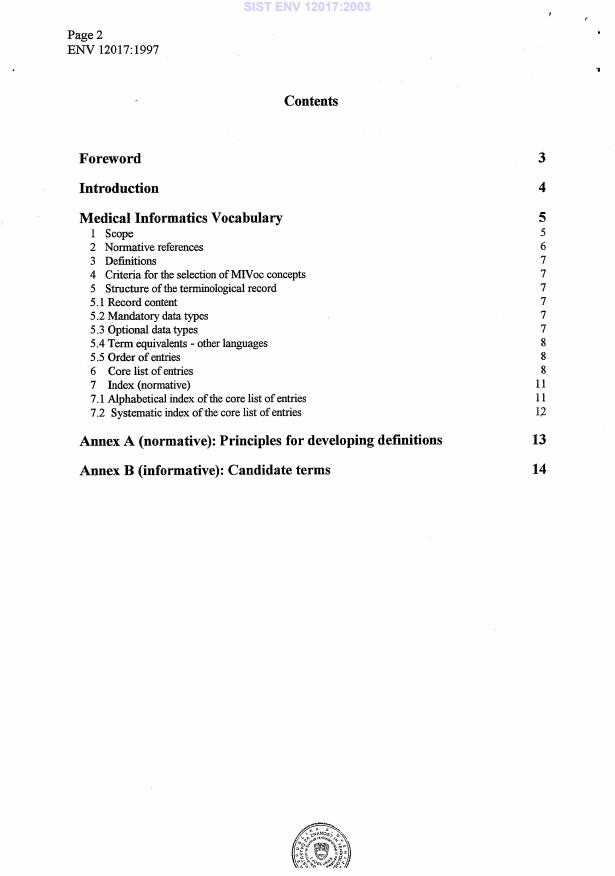 ENV 12017:1997 is a standardization document published by the European Committee for Standardization (CEN). Its full title is "Medical Informatics - Medical Informatics Vocabulary (MIVoc)". This standard covers: This European Prestandard is applicable to international communication in the field of Medical Informatics standardization. It presents a core list of concepts with their definitions which have been approved in CEN/TC 251 prestandards. Although this version contains only English terms, provision has been made for the accomodation of European language and culture specific concepts of Medical Informatics.