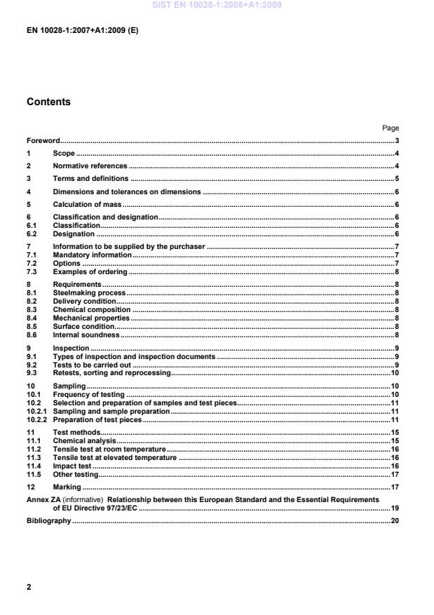 EN 10028-5 or EN 10028-6; for stainless steels – the process route selected from the relevant table of EN 10028-7; h) inspection document to be issued (see 9.1.1). 7.2 Options A number of options are specified in this part of EN 10028 and listed below. If the purchaser does not indicate a wish to implement any of these options at the time of enquiry and order, the products shall be supplied in accordance with the basic specification (see 7.1). 1) deviating tolerance class (see 4.1 a)); 2) specification of the steelmaking process (see 8.1.1); 3) mechanical properties after additional heat treatment (see 8.4.1); 4) specification of special classes for the reduction of area (see 8.4.2); 5) verification of internal soundness (see 8.6); 6) one or several of the optional tests (see Table 1); 7) deviating frequency of testing (see 10.1.1 and 10.1.3); 8) deviating delivery condition (see 10.2.1.3); 9) use of longitudinal test pieces for the impact test (see 10.2.2.3); 10) specification of an analytical method (see 11.1); 11) temperature of the tensile test at elevated temperature (see 11.3); 12) deviating testing temperature for the impact test (see 11.4); 13) marking method (see 12.1); 14) special marking (see 12.2 and 12.3). SIST EN 10028-1:2008+A1:2009