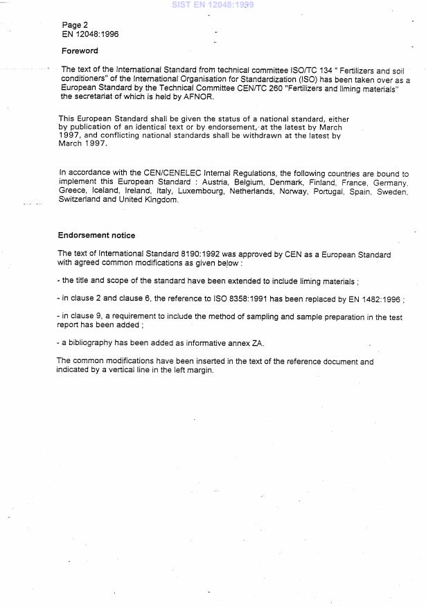 EN 12048:1996 is a standard published by the European Committee for Standardization (CEN). Its full title is "Solid fertilizers and liming materials - Determination of moisture content - Gravimetric method by drying at (105 +/- 2)°C (ISO 8190:1992 modified)". This standard covers: This International Standard specifies a gravimetric method, by drying at (102 +/- 2) °C, for the determination of the moisture content of fertilizers and limong materials. The method is applicable to siliceous and carbonic liming materials and the following phosphatic fertilizers: - superphosphates; - natural phosphates; - ground rock phosphates; - partially solubilized rock phosphates. The method is not applicable to hydrated and burnt lime and to ammonium compounds or magnesium sulfates.