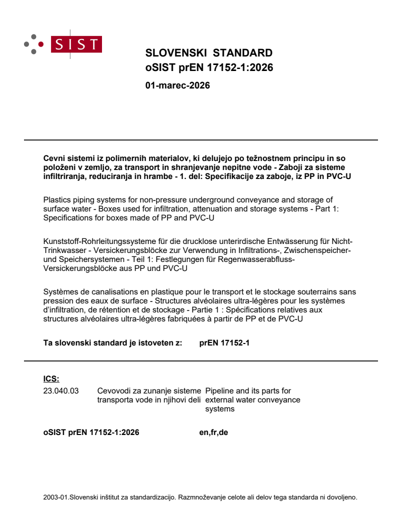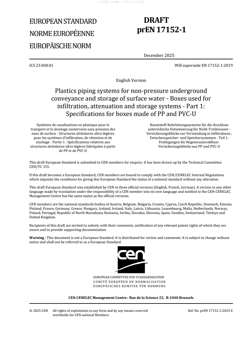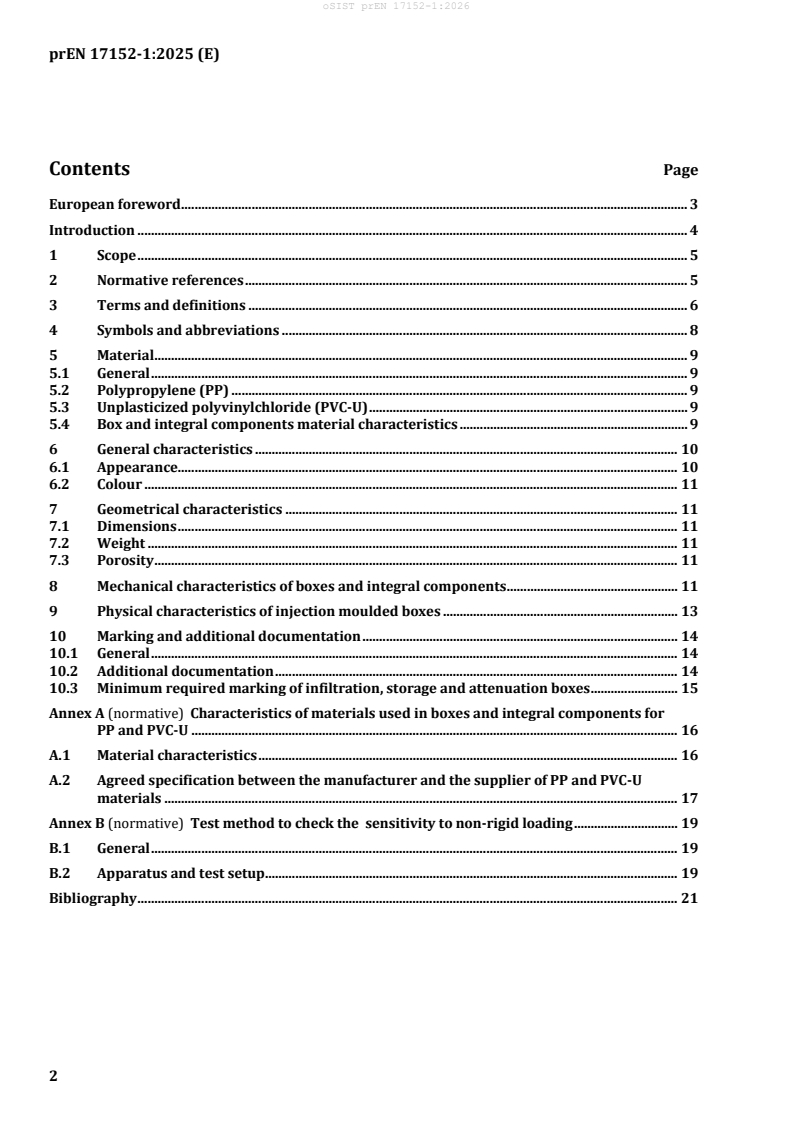 prEN 17152-1 is a draft published by the European Committee for Standardization (CEN). Its full title is "Plastics piping systems for non-pressure underground conveyance and storage of surface water - Boxes used for infiltration, attenuation and storage systems - Part 1: Specifications for boxes made of PP and PVC-U". This standard covers: This document gives the definitions and specifies the minimum requirements for injection moulded, extruded and thermoformed thermoplastics cuboid shaped boxes, including integral components, used in underground systems for infiltration, attenuation and storage of surface water (e.g. storm water) and manufactured from polypropylene (PP) or unplasticized polyvinylchloride (PVC-U). Product properties are determined by a combination of material specifications, design and manufacturing process. These boxes are intended for buried underground use, e.g. in landscape, pedestrian or vehicular traffic areas. A box can either be factory assembled, or site assembled from different components. These boxes are intended to be used as elements in a modular system where the manufacturer states in the documentation how the components are assembled to create a complete infiltration, attenuation or storage system. NOTE Non load bearing component(s) can be manufactured by various methods e.g. extrusion, injection moulding, rotational moulding, thermoforming and low-pressure injection moulding.