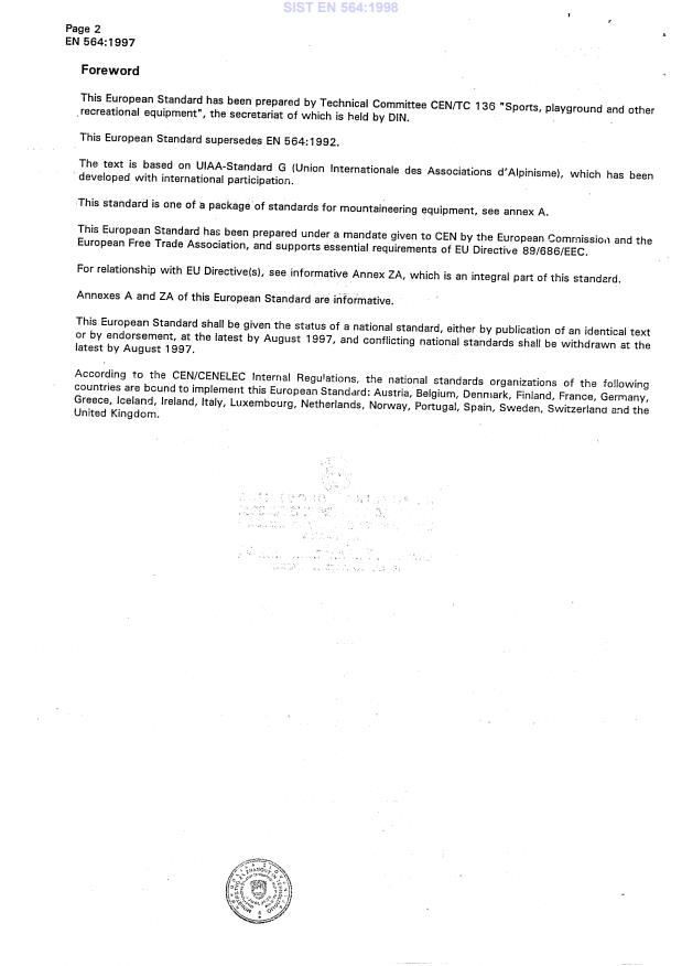 EN 564:1997 is a standard published by the European Committee for Standardization (CEN). Its full title is "Mountaineering equipment - Accessory cord - Safety requirements and test methods". This standard covers: This European Standard specifies requirements and test methods for accessory cord comprising a core and a sheath, supplied on a drum or in separate lengths, for use in mountaineering including climbing.