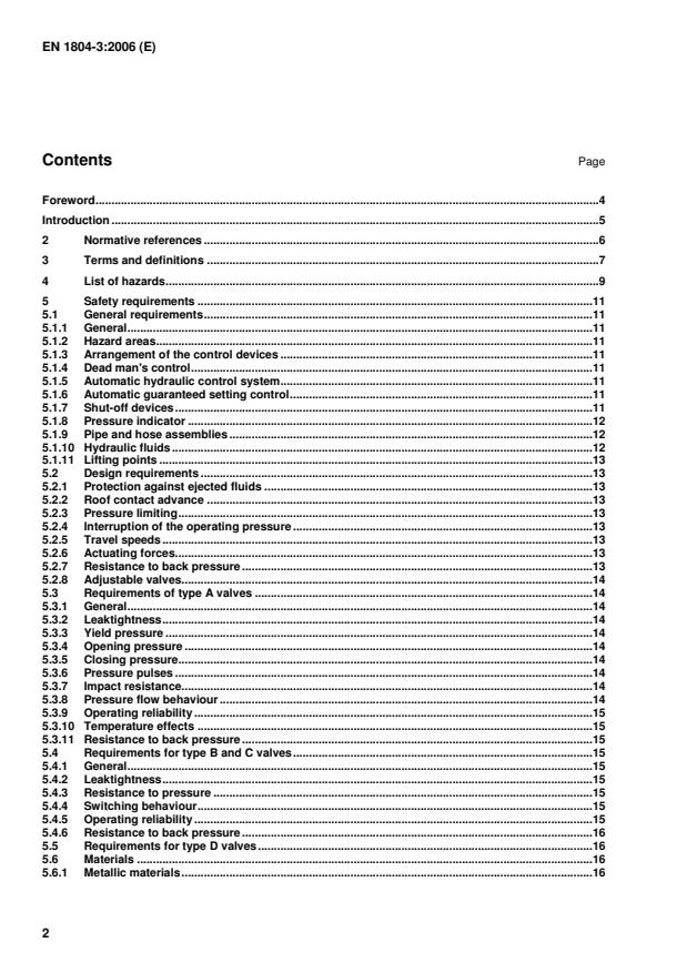 List of hazards.9 5 Safety requirements.11 5.1 General requirements.11 5.1.1 General.11 5.1.2 Hazard areas.11 5.1.3 Arrangement of the control devices.11 5.1.4 Dead man's control.11 5.1.5 Automatic hydraulic control system.11 5.1.6 Automatic guaranteed setting control.11 5.1.7 Shut-off devices.11 5.1.8 Pressure indicator.12 5.1.9 Pipe and hose assemblies.12 5.1.10 Hydraulic fluids.12 5.1.11 Lifting points.13 5.2 Design requirements.13 5.2.1 Protection against ejected fluids.13 5.2.2 Roof contact advance.13 5.2.3 Pressure limiting.13 5.2.4 Interruption of the operating pressure.13 5.2.5 Travel speeds.13 5.2.6 Actuating forces.13 5.2.7 Resistance to back pressure.13 5.2.8 Adjustable valves.14 5.3 Requirements of type A valves.14 5.3.1 General.14 5.3.2 Leaktightness.14 5.3.3 Yield pressure.14 5.3.4 Opening pressure.14 5.3.5 Closing pressure.14 5.3.6 Pressure pulses.14 5.3.7 Impact resistance.14 5.3.8 Pressure flow behaviour.14 5.3.9 Operating reliability.15 5.3.10 Temperature effects.15 5.3.11 Resistance to back pressure.15 5.4 Requirements for type B and C valves.15 5.4.1 General.15 5.4.2 Leaktightness.15 5.4.3 Resistance to pressure.15 5.4.4 Switching behaviour.15 5.4.5 Operating reliability.15 5.4.6 Resistance to back pressure.16 5.5 Requirements for type D valves.16 5.6 Materials.16 5.6.1 Metallic materials.16