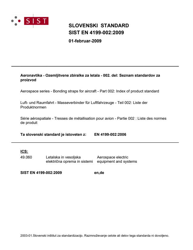 2003-01.Slovenski inštitut za standardizacijo. Razmnoževanje celote ali delov tega standarda ni dovoljeno.Aeronavtika - Ozemljitvene zbiralke za letala - 002. del: Seznam standardov za proizvodLuft- und Raumfahrt - Masseverbinder für Luftfahrzeuge - Teil 002: Liste der ProduktnormenSérie aérospatiale - Tresses de métallisation pour avion - Partie 002 : Liste des normes de produitAerospace series - Bonding straps for aircraft - Part 002: Index of product standard49.060Aerospace electric equipment and systemsICS:Ta slovenski standard je istoveten z:EN 4199-002:2006SIST EN 4199-002:2009en,de01-februar-2009SIST EN 4199-002:2009SLOVENSKI