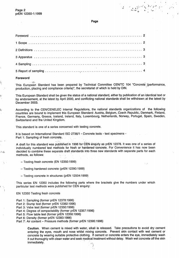 EN 12350-1:1999 is a standard published by the European Committee for Standardization (CEN). Its full title is "Testing fresh concrete - Part 1: Sampling". This standard covers: This standard specifies two procedures for sampling fresh concrete, by composite sampling and by spot sampling.