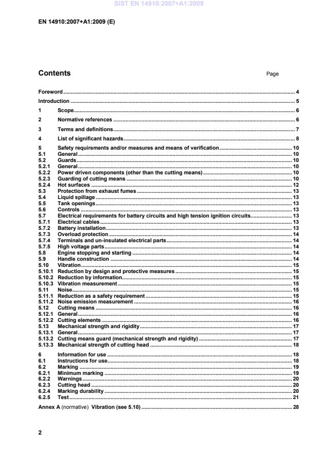 Cutting means control 5.6, 6.2 Engine stopping 5.7.4, 5.8 9 Hazards due to break-up during operation Cutting means 5.12 Cutting head 5.13.3, 6.2.3 10 Hazards due to insufficient instructions for the driver/operator Instructions for use 6.1, 6.2, Annex E, Annex F SIST EN 14910:2007+A1:2009