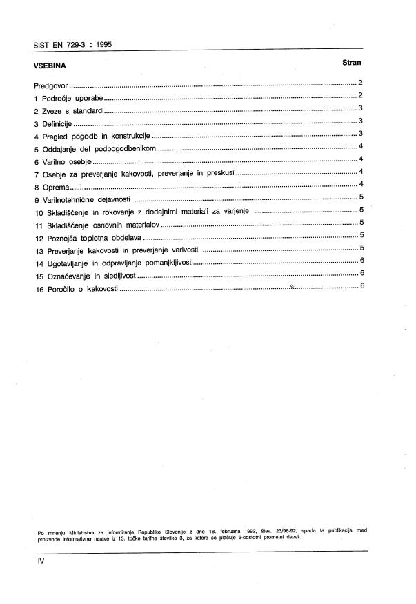 EN 729-3:1994 is a standard + national annex and/or foreword published by the European Committee for Standardization (CEN). Its full title is "Quality requirements for welding - Fusion welding of metallic materials - Part 3: Standard quality requirements". This standard covers: This standard has been prepared such that: - it is independent of the type of welded construction to be manufactured; - it defines quality requirements for welding both in workshops and on site; - it provides guidance for describing a manufacturers capability to produce welded constructions to meet specified requirements; - it may also be used as a basis for assessing the manufacturer in respect to his welding capability. This standard is appropriate when demonstration of a manufacturers capability to produce welded construction, fulfilling specified quality requirements, are specified in one or more of the following: - a contract between involved parties; - an application standard; - a regulatory requirement. The requirements contained within this standard may be adopted in full or may be selectively deleted by the manufacturer if not applicable to the construction concerned. They provide a flexible framework for the control of welding in the following cases: - Case 1 To provide specific requirements for fusion welding in contracts which require the manufacturer to have a quality system other than EN 29001 or EN 29002. - Case 2 To provide specific requirements for fusion welding as guidance to a manufacturer developing a quality system. - Case 3 To provide specific requirements for references in application standards which uses fusion welding as part of its requirements or in a contract between relevant parties. It may however be more appropriate for EN 729-4 to be used in such cases.