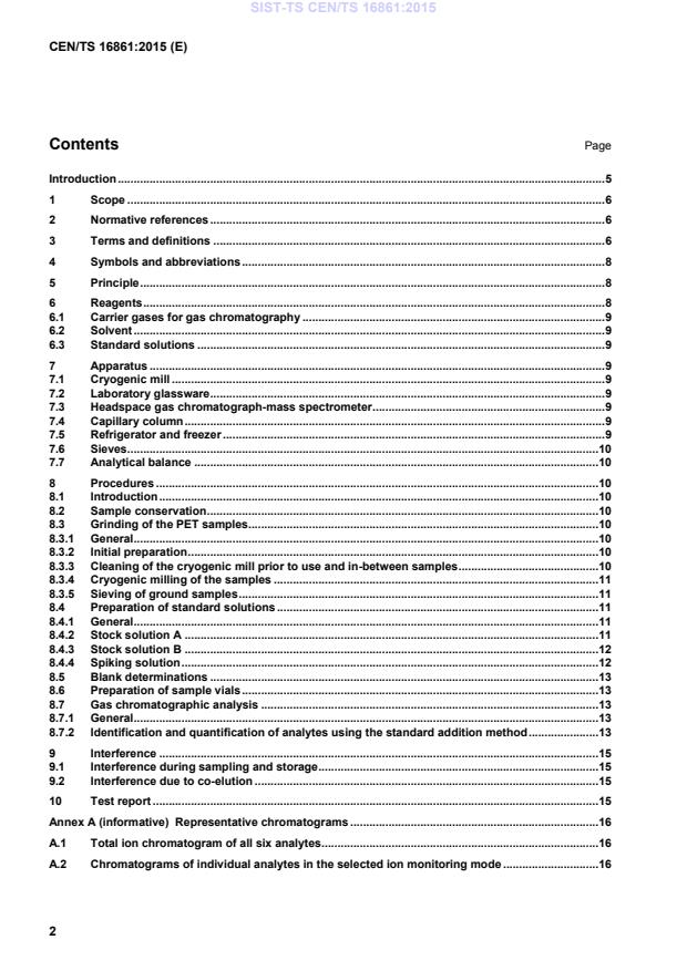 Ta tehnična specifikacija določa analizno metodo za preskušanje recikliranega polietilenskega tereftalata (PET), primernega za uporabo v prehrani. Ta analizna metoda zagotavlja/je namenjena uporabi v okviru kontrole kakovosti. Ta preskus določa in količinsko opredeljuje nekatera opredeljena onesnaževala. Takim onesnaževalom se reče označevalci spojin.