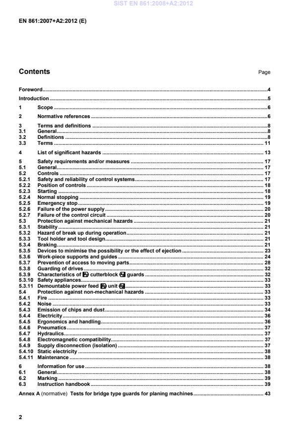 EN 861:2007+A2:2012 is a standard published by the European Committee for Standardization (CEN). Its full title is "Safety of woodworking machines - Surface planing and thicknessing machines". This standard covers: This document specifies all significant hazards, hazardous situation and events as listed in Clause 4 relevant to stationary and displaceable surface planing and thicknessing machines with an integrated feed in thicknessing mode, (with or without demountable power feed unit in planning mode) and with manual loading and unloading of the work-piece, hereinafter referred to as machines. The cutterblock is fixed in position and for thicknessing an integrated feed is provided. The machines are designed to cut solid wood, chipboard, fibreboard and plywood when they are used as intended and under the conditions foreseen by the manufacturer including reasonably foreseeable misuse. Machines which are designed to work wood based materials may also be used for thicknessing hardened plastic materials with similar physical characteristics as wood. This document does not deal with any hazards which result from the attachment of an optional mortising unit. These hazards are covered by EN 940:2009+A1:2012. This document does not apply to: a) machines set up on a bench or a table similar to a bench, which are intended to carry out work in a stationary position, capable of being lifted by one person by hand; NOTE 1 Transportable motor-operated electric tools are covered by the requirements of #EN 61029-1:2009$ together with #EN 61029-2-3:2011$. b) surface planing and thicknessing machines where the cutterblock is adjustable for depth of cut setting in thicknessing mode; c) machines where the conversion from planing to thicknessing mode or vice versa is achieved by mounting or demounting parts/units; d) machines where surfacing and thicknessing can be performed at the same time. This document is not applicable to surface planing and thicknessing machines which are manufactured before the date of its publication as EN. NOTE 2 Machines covered by this document are listed under A.5 of Annex IV of the Machinery Directive.