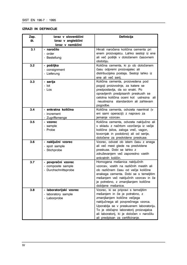 prevzet evropski standard EN 196-7, Methods of testing cement - Part 7: Methods of taking